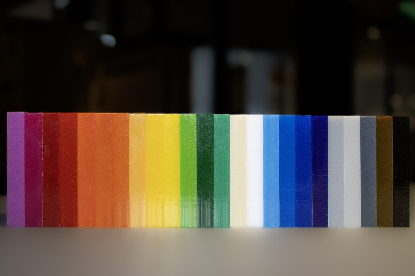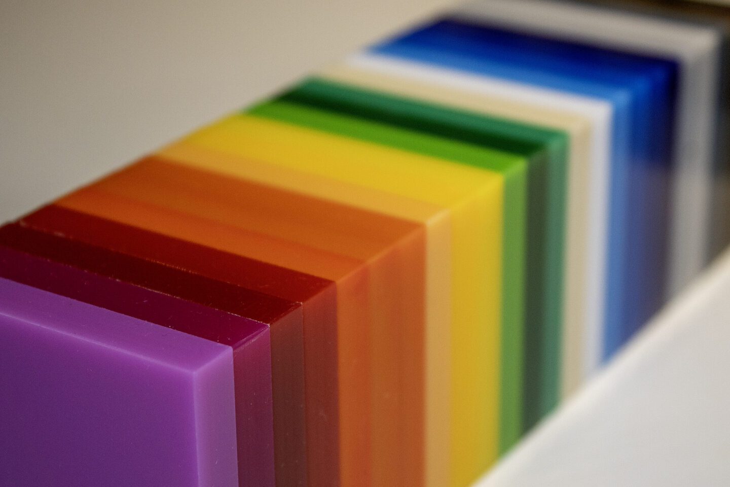 Vos Kunststoffen levert 11 kleuren gekleurd Plexiglas®, elk met een vaste samenstelling en afwerking: